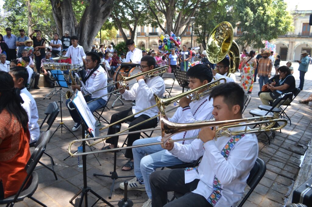 Banda Infantil y Juvenil de Pueblo Nuevo en el zócalo de la ciudad de Oaxaca de Juárez en concierto.