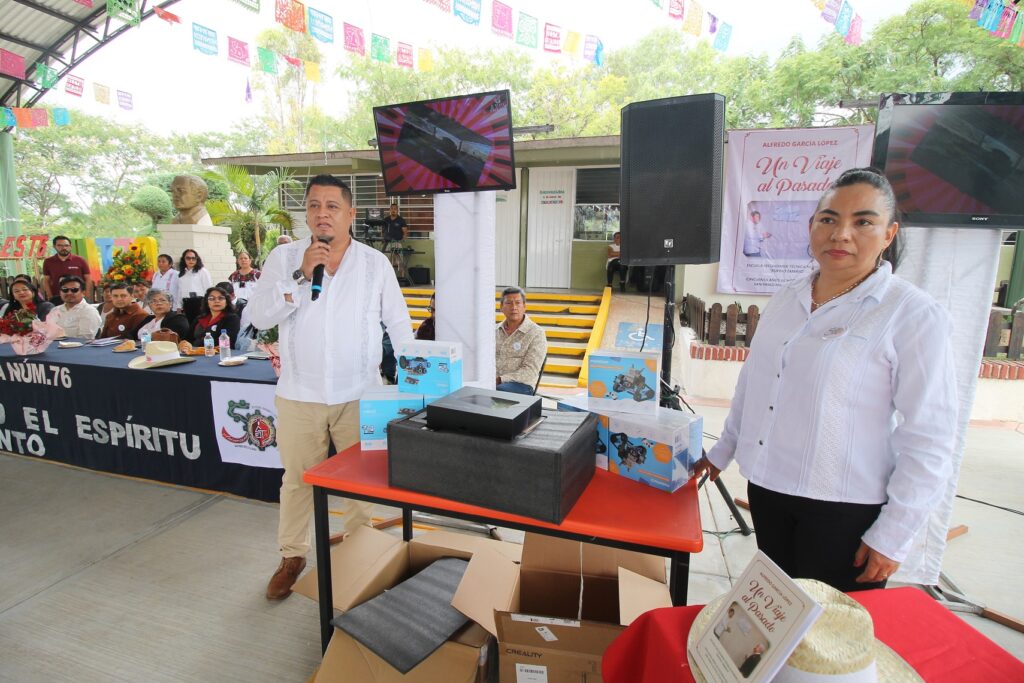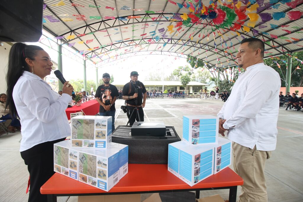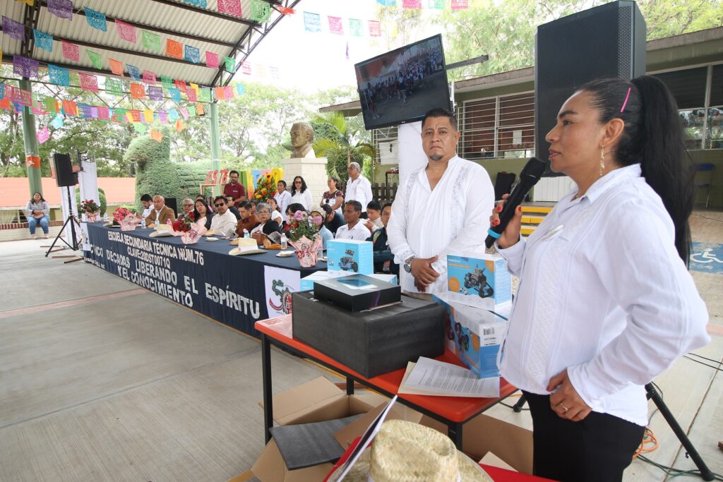 En el acto de aniversario a nombre del Gobernador Constitucional del Estado, Ing. Salomón Jara Cruz, del director general del IEEPO el Lcdo. Emilio Montero Pérez y del director de Tecnologías Educativas Lcdo. Manuel Raúl Mátus Perpenti, se hizo la entrega a la Profesora Xóchitl López Sernas, directora de la Institución antes mencionada, del siguiente equipo tecnológico: 5 kits de robots Makeblock mBot2, 5 Add-on Pack Rover X (extensión de mBot2), 1 Impresora 3D Ender-3 V3 SE y 1 Sonic Pad+Nebula Cámara.