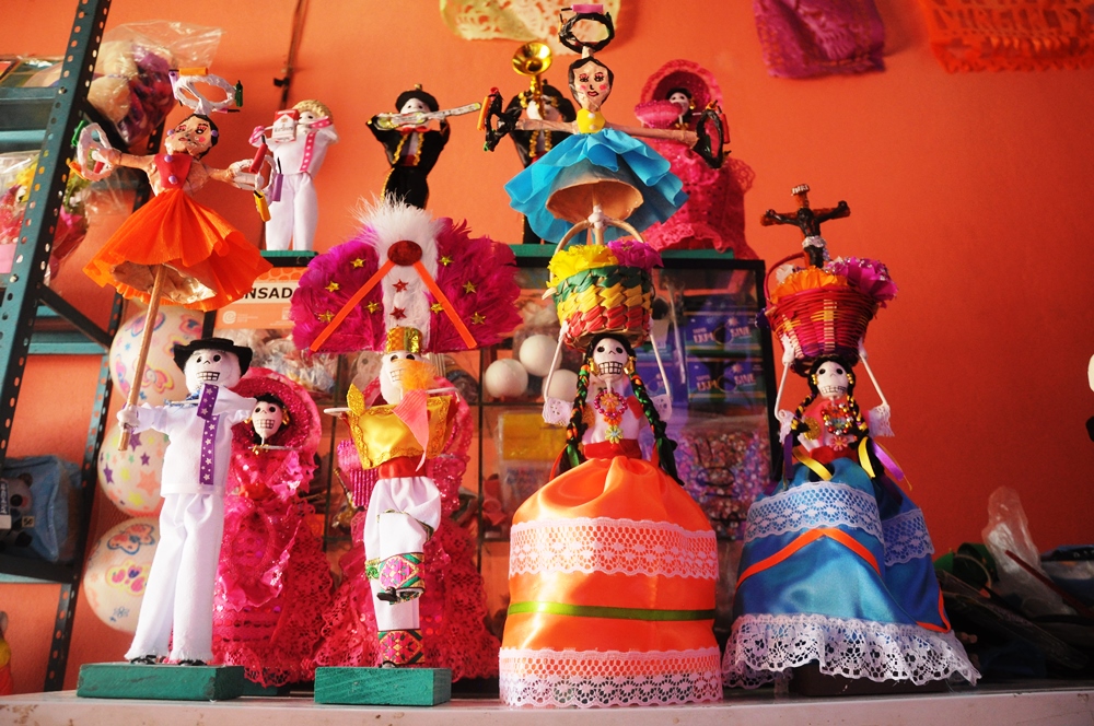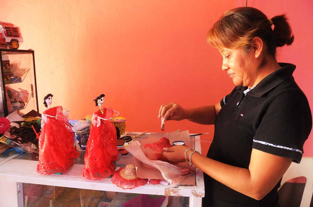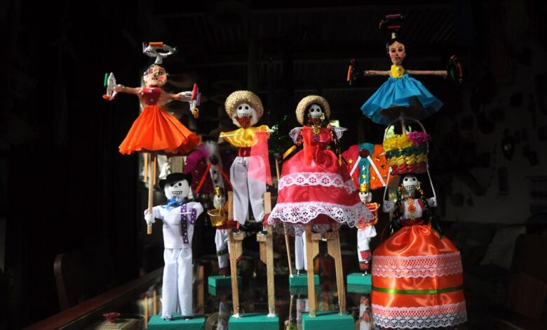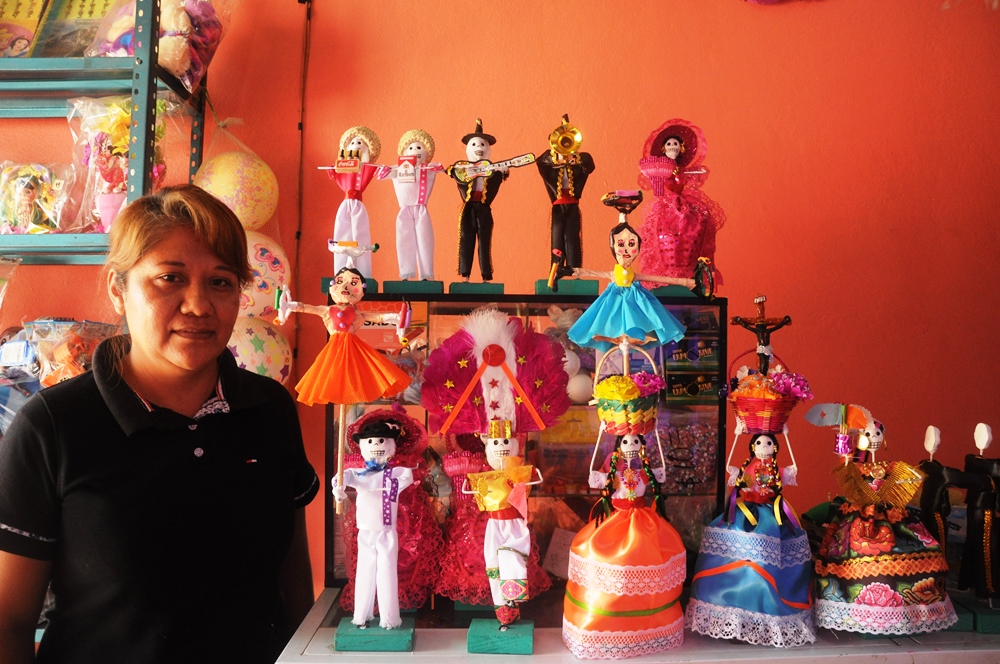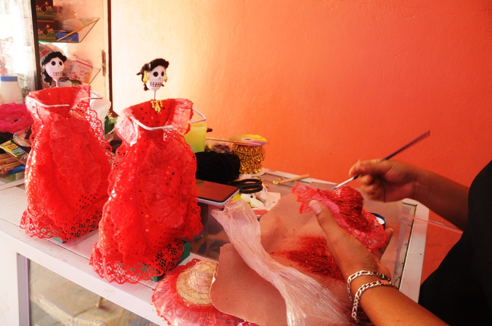Oaxaca de Juárez Oaxaca México.- Cada año nuestra artista con sus manos va dando forma a cada una de sus obras de arte en Calaveras, con alambre, madera, tela y un sin fin de objetos para la realización de cada una hermosa y bella, en este año destacan los zancudos de zaachila, la china de calenda que en su canasta lleva pirotecnia para la quema en las calendas, así mismo el farolero que lleva en sus manos pirotecnia para la quema en las tradicionales calendas de Oaxaca.