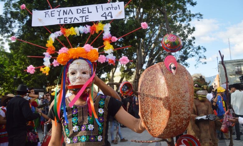 Jóvenes de los bachilleres de Oaxaca, siempre has mostrado mucha creatividad en sus disfraces en estas festividades, muy alegres en sus participaciones unos trabajando en equipo para sacar adelante la comparsa que muestra muchos trajes con objetos reciclados dando vida y color a esta bella festividad en Oaxaca México.