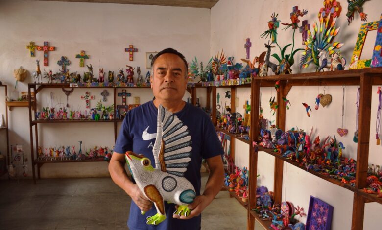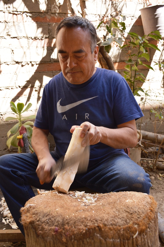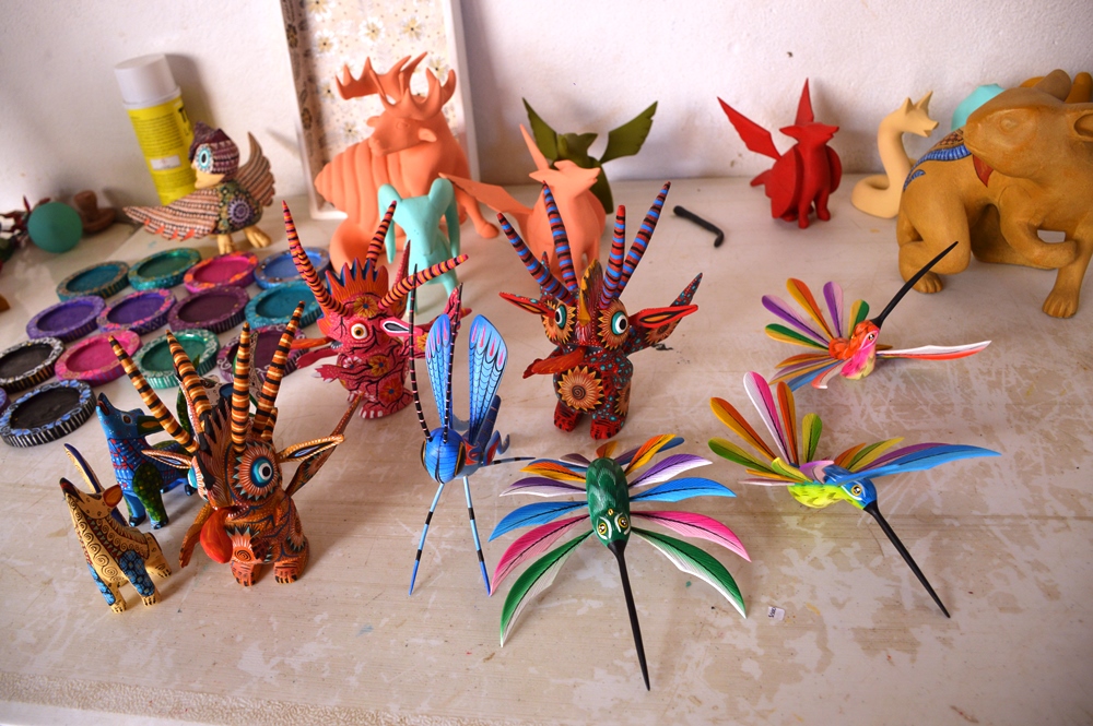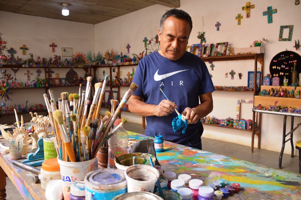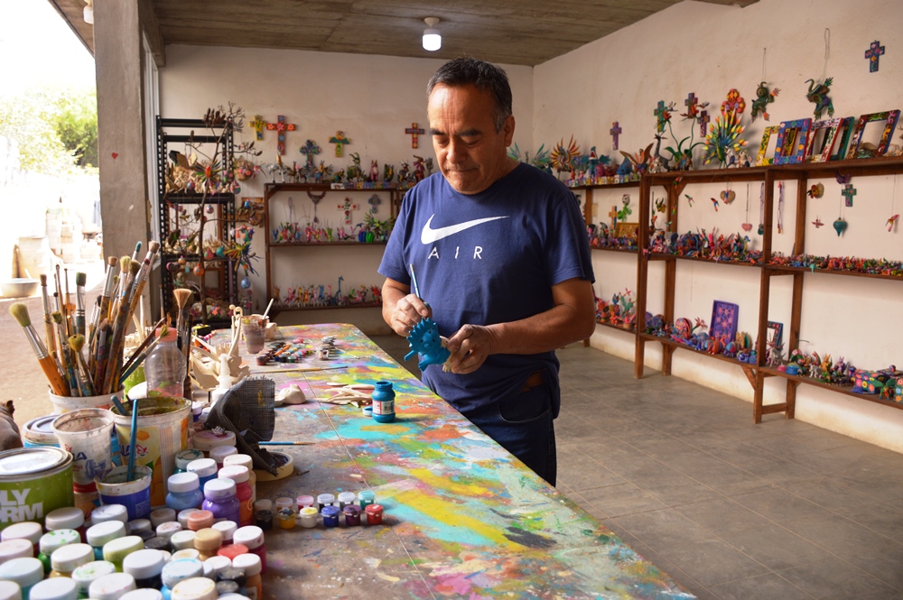 Miguel Ángel Ortega Cruz, nos muestra su trabajo que realiza en su taller ubicado en avenida Independencia #03 cerca del templo de la población, luego de mostrarnos como va trabajando la madera de copal, así como su preparación para realizar cada una de las obras las cuales tienen que ser de una sola pieza, pues es ahí donde se conoce y valora el trabajo de las manos creadoras que con imaginación y creatividad realizan bellas obras de arte que luego decoran con colores hermosos que cautivan a propios y extraños.