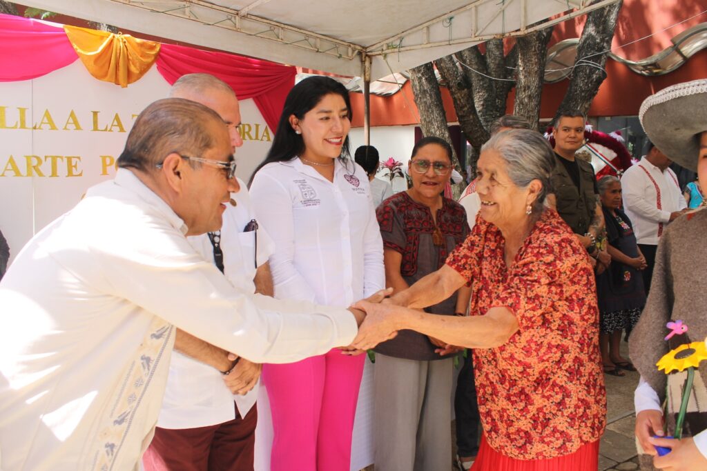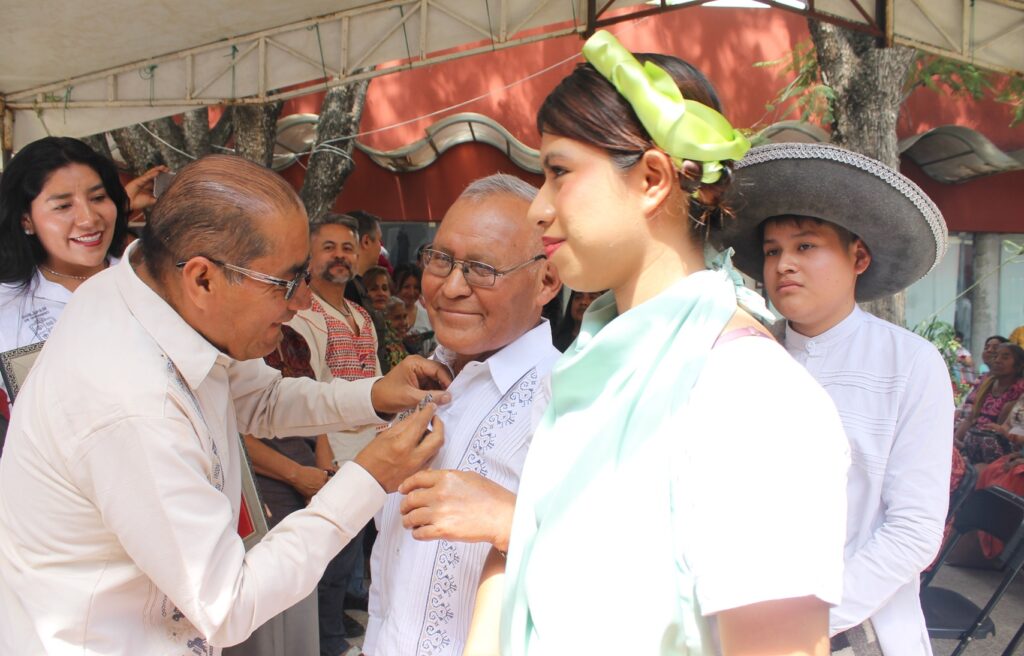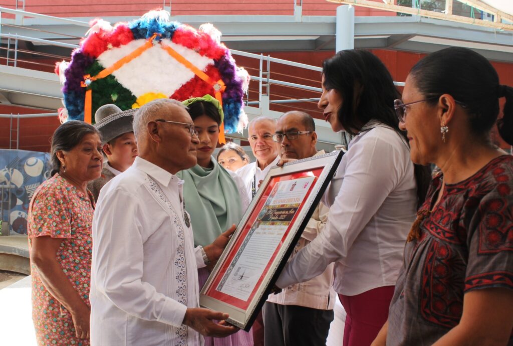 Reconocimiento estatal al maestro Prisciliano Higinio Ruíz Ramírez y esposa Reyna Hernández Vasquez (arte plumario) Cuilapam de Guerrero, presente la presidente de este municipio Mayra Silva.