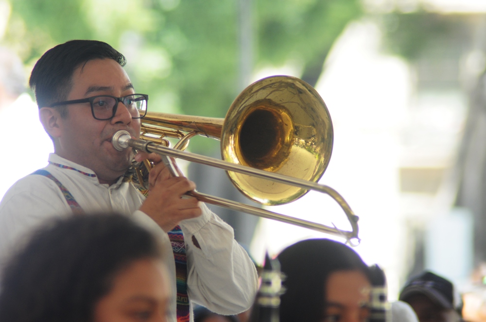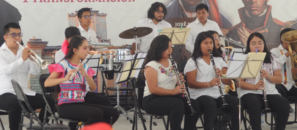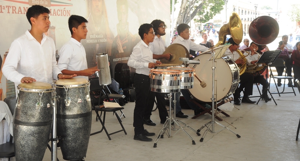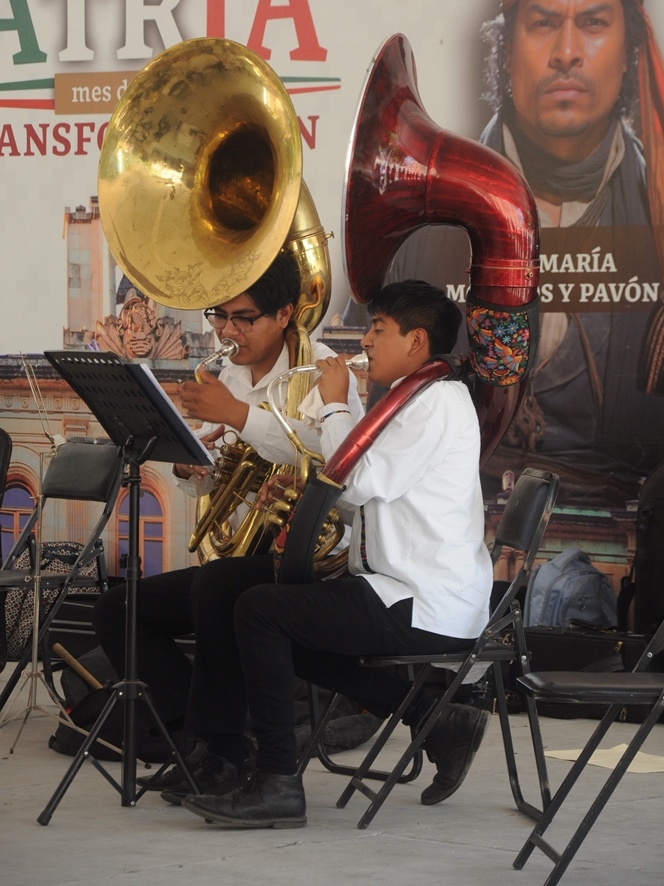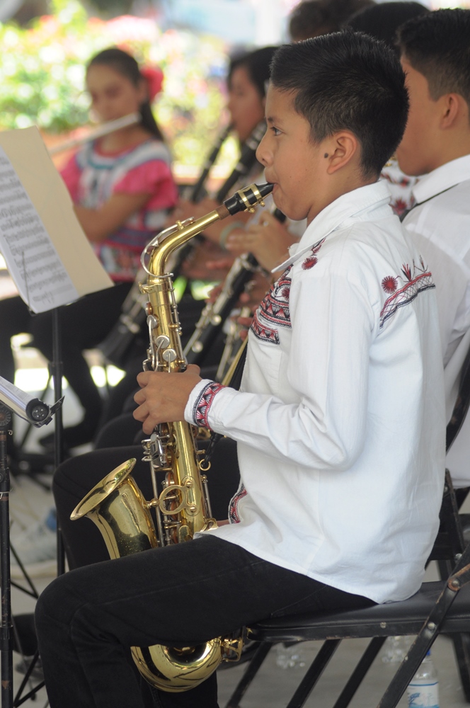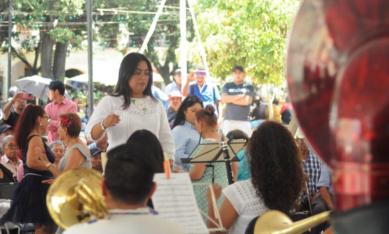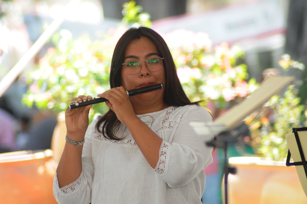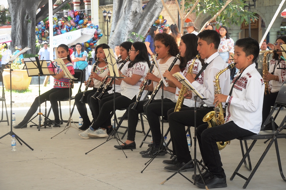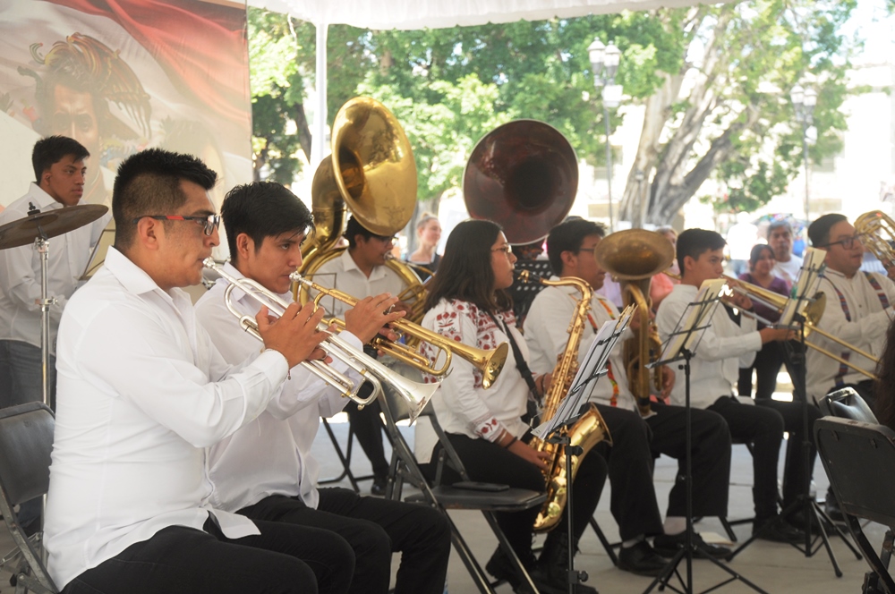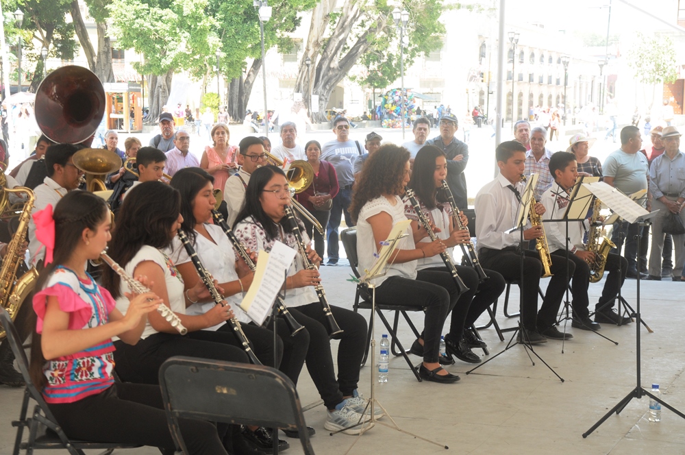 Oaxaca de Juárez Oaxaca México.- En el zócalo de la ciudad de Oaxaca de Juárez, este domingo la banda filarmonica «Nhake Bi’ La’ « ofreció el concierto dominical donde a la batuta de Fátima García, quien dirigió a los jovenes integrantes entre mujeres y hombres, quienes hicieron bailar a los presentes con los temas regionales de Oaxaca.