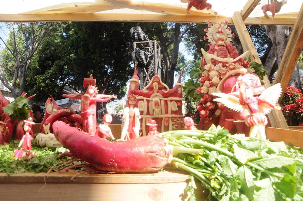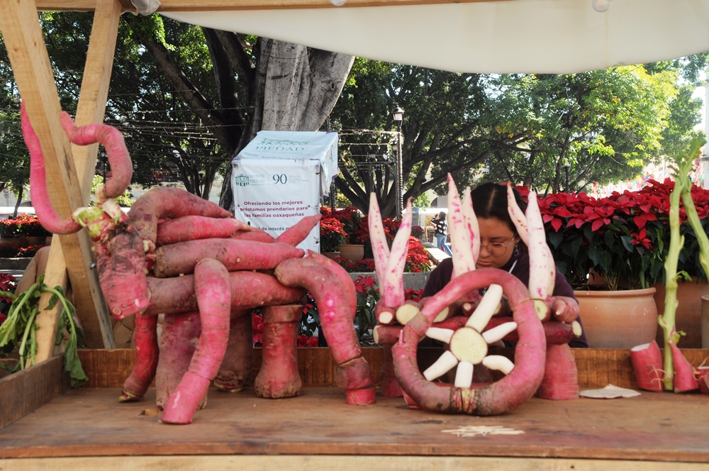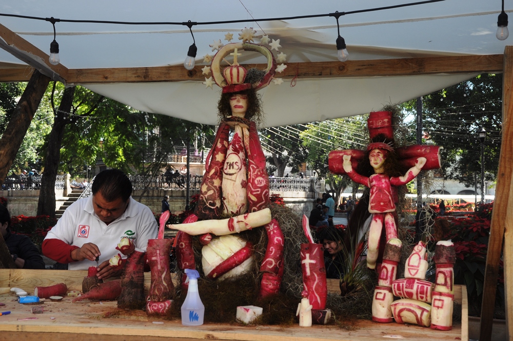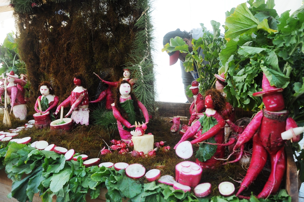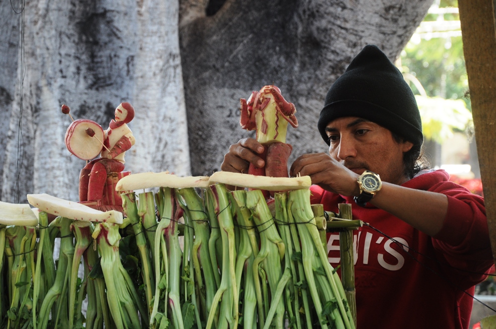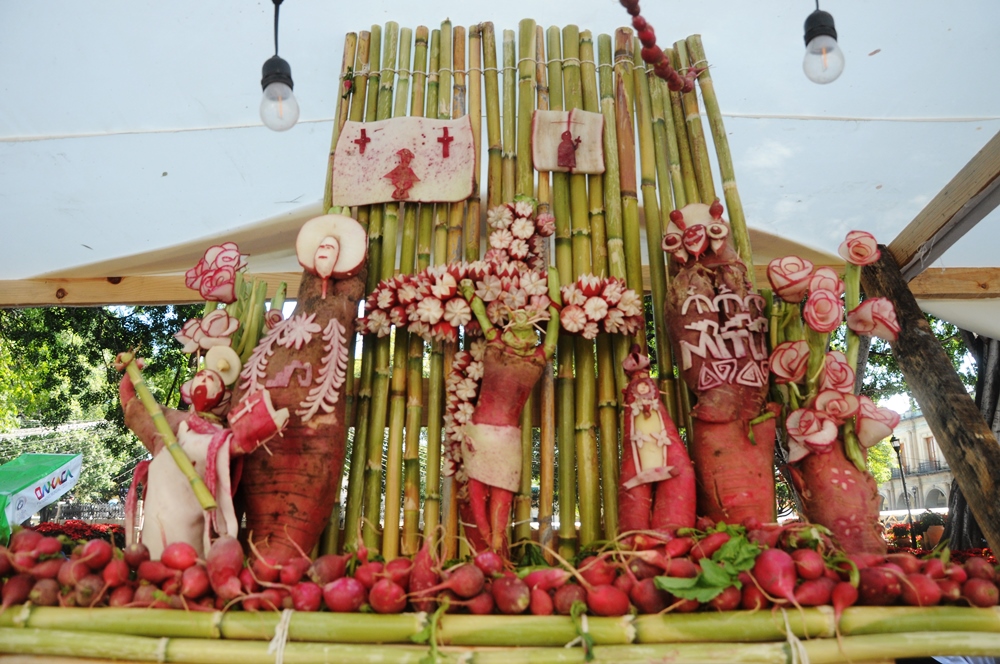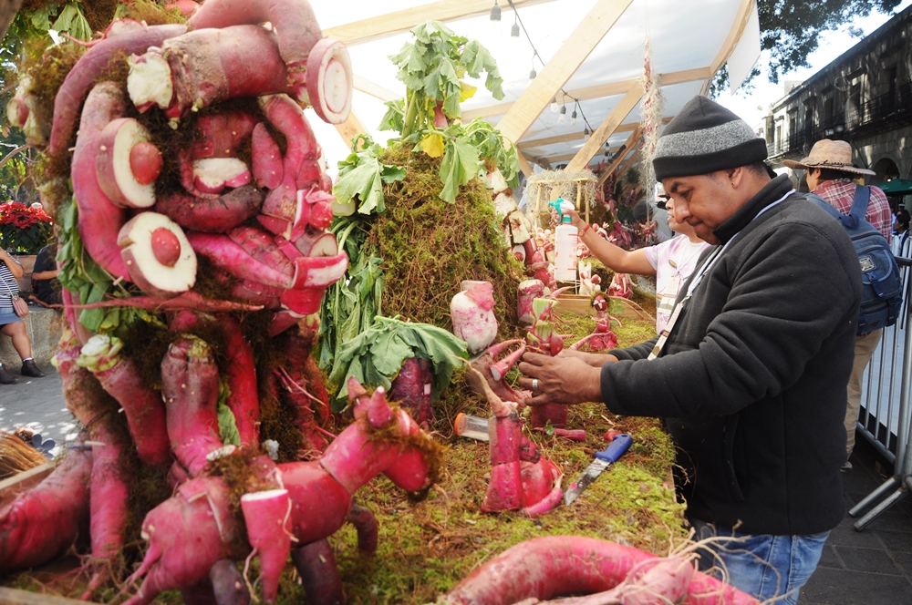 Oaxaca de Juárez Oax.México.- Vuelve a cautivar las manos de los artistas que participan en la tradicional noche de rábanos única en este hermoso estado del sureste mexicano, con hermosas y bellas obras de arte elaboradas con el tubérculo, donde luego de la cosecha tienen máximo cuatro días para elaborar las obras con las que concursan y en donde se ve el trabajo de muchas horas pues en varias de estas tienen un gran trabajo para su elaboración.