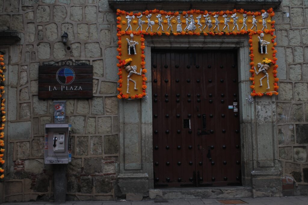 Detalles en fachada «Plaza», donde se encuentra una gran variedad de artesanías de las ocho regiones de Oaxaca México, en la calle de Murguía en el centro histórico de la capital oaxaqueña.