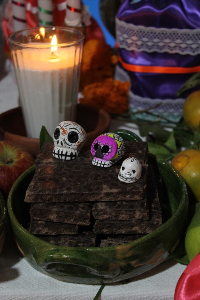Chocolate elaborado con cacao de «Chocolate Mayordomo», en cazuela de barro verde vidriado de las manos de mujeres de Santa María Atzompa, calaveras talla en madera de Arrazola Xoxocotlán y San Martín Tilcajete Ocotlán de Morelos, Oaxaca México.