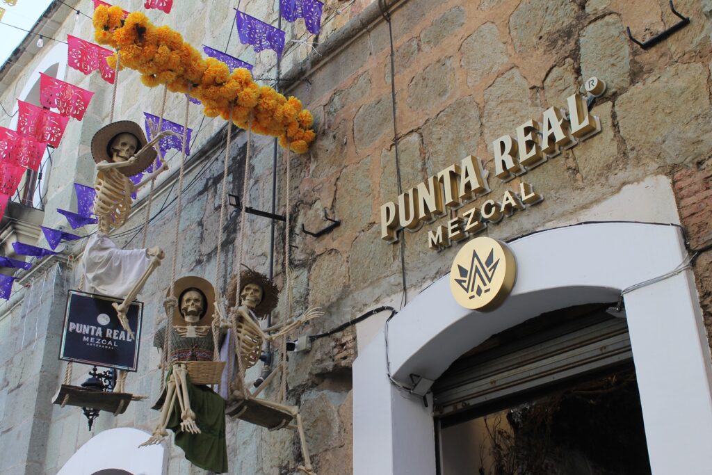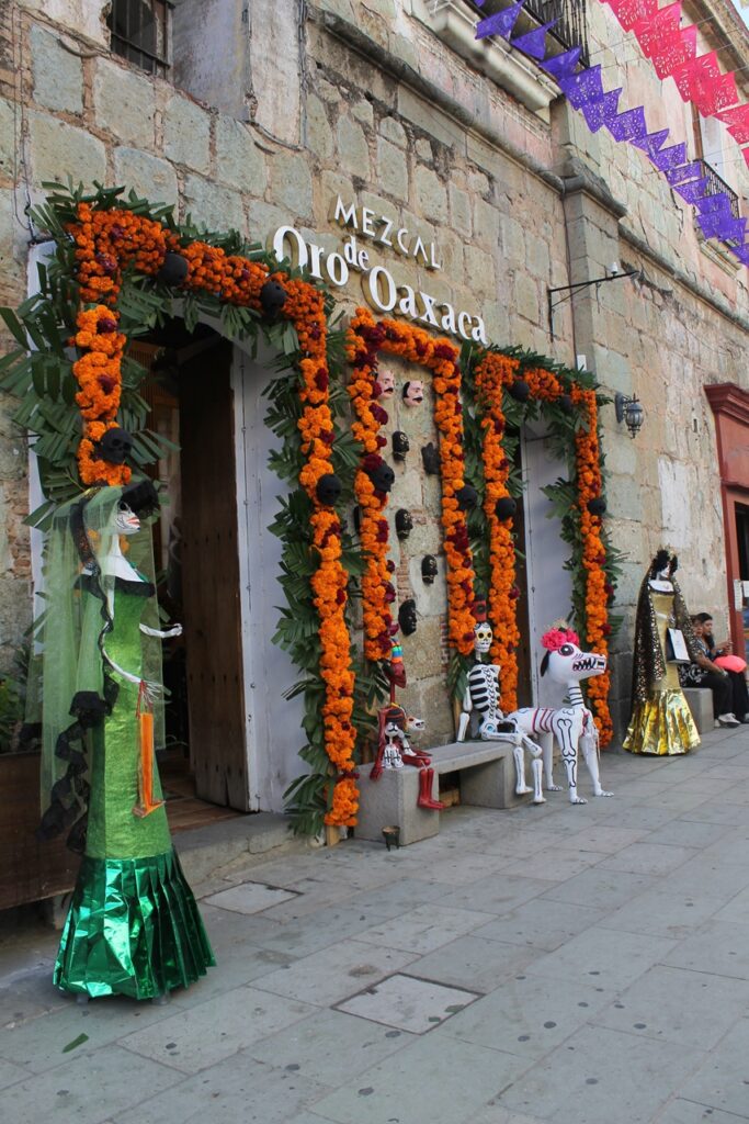 Las tiendas donde se expende el exquisito mezcal oaxaqueño en sus diferentes variedades también colocas adornos alusivos a esta festividad calaveras y catrinas que elaboran las manos oaxaqueñas.