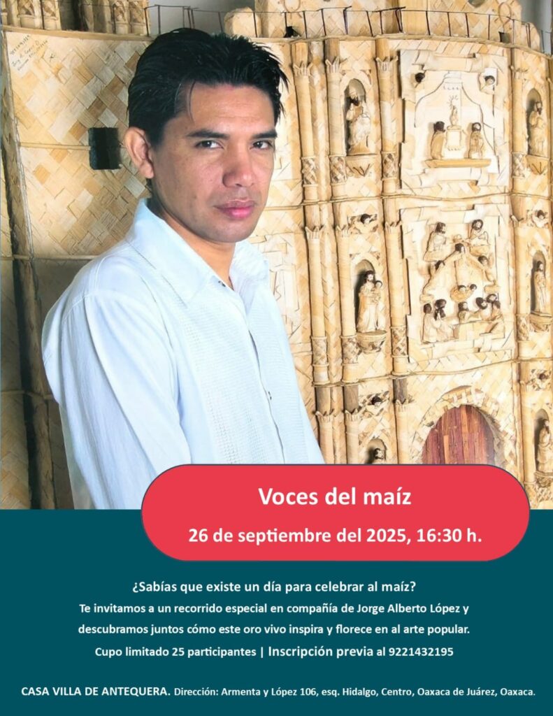 Ven a conocer a: Jorge Alberto López, autor de esta hermosa obra de arte en hoja de maíz (totomoxtle), este viernes 26 de septiembre, en Casa Villa de Antequera en el centro histórico de la ciudad de Oaxaca de Juárez.