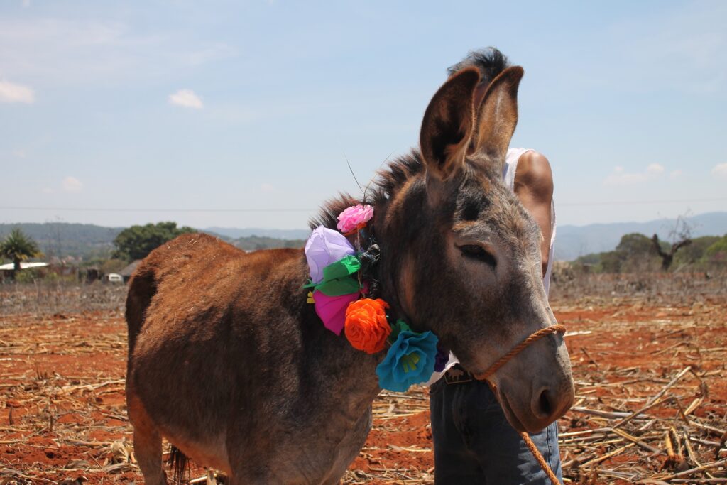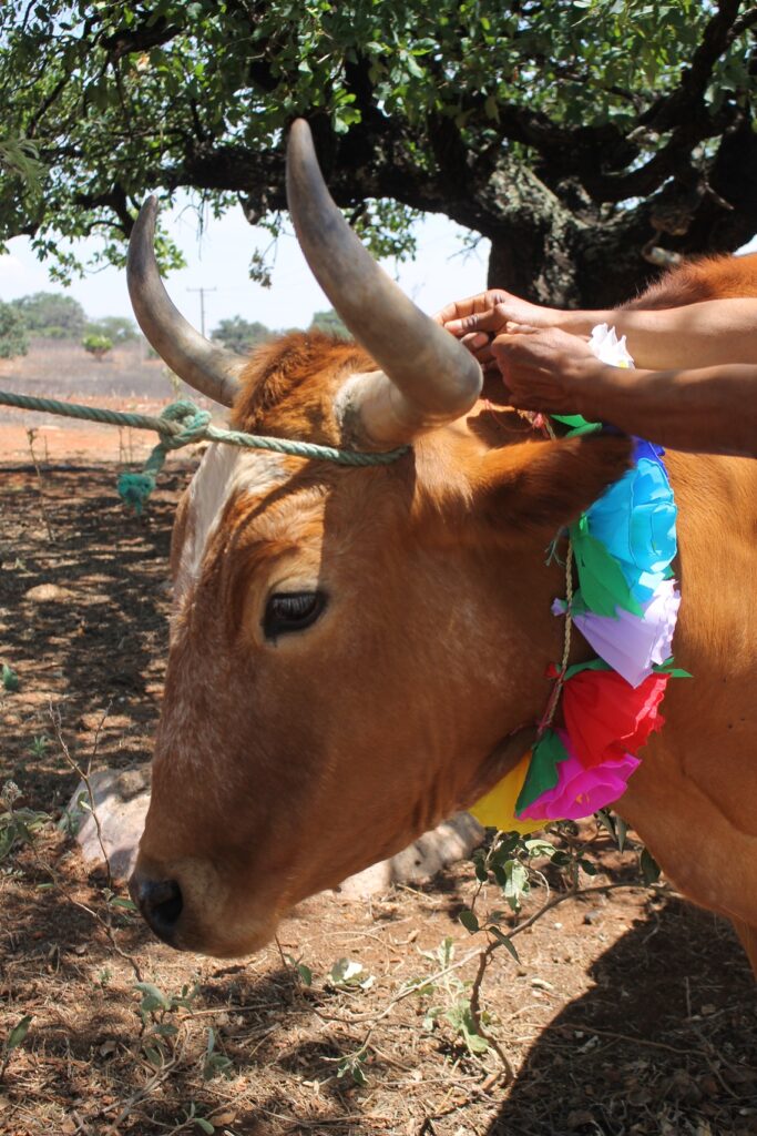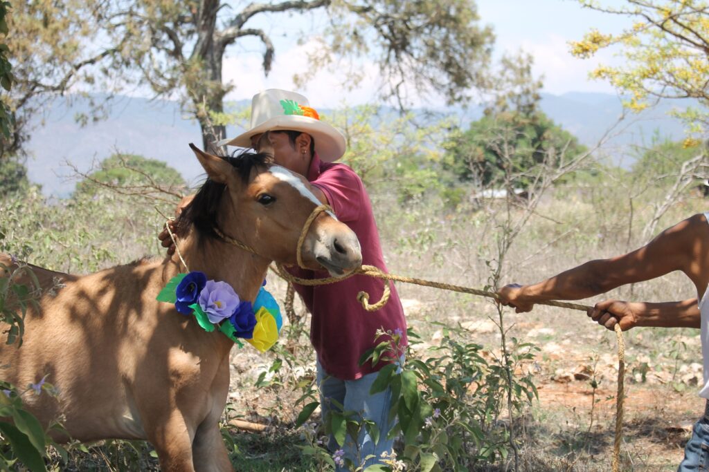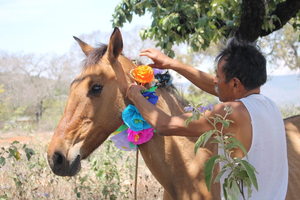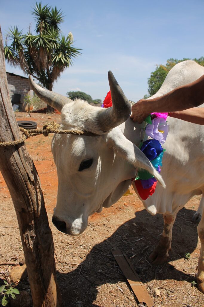 Yucuxina adorna con flores a sus animales de trabajo hoy día de San Isidro Labrador.