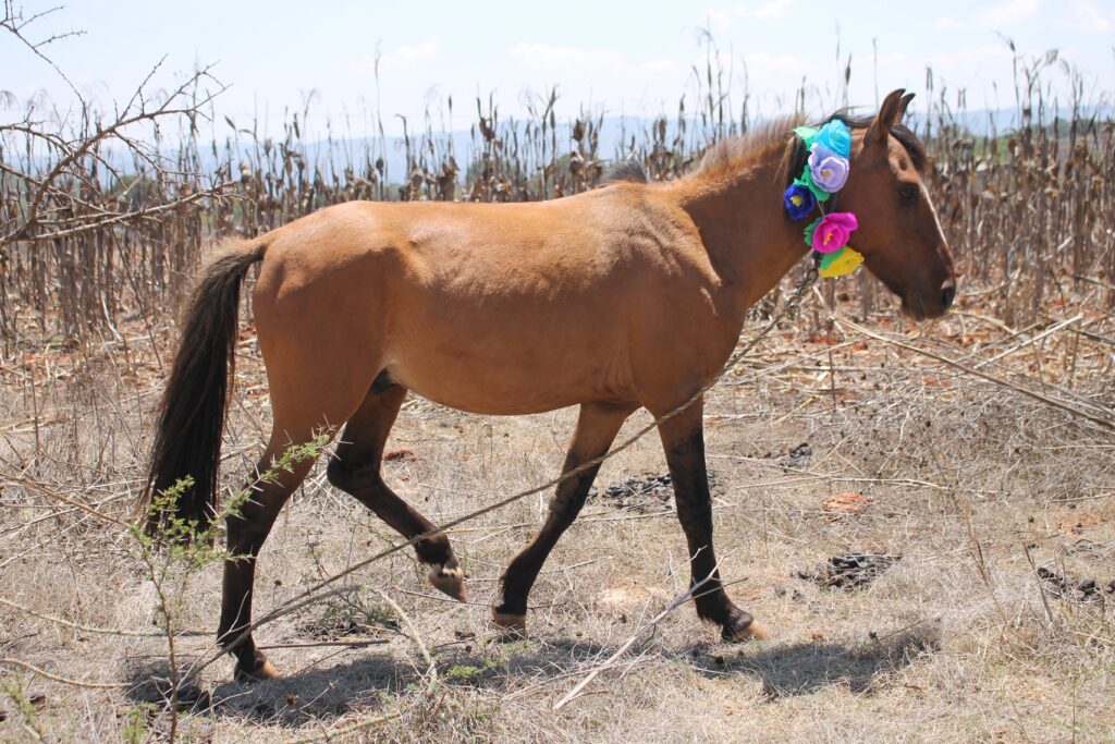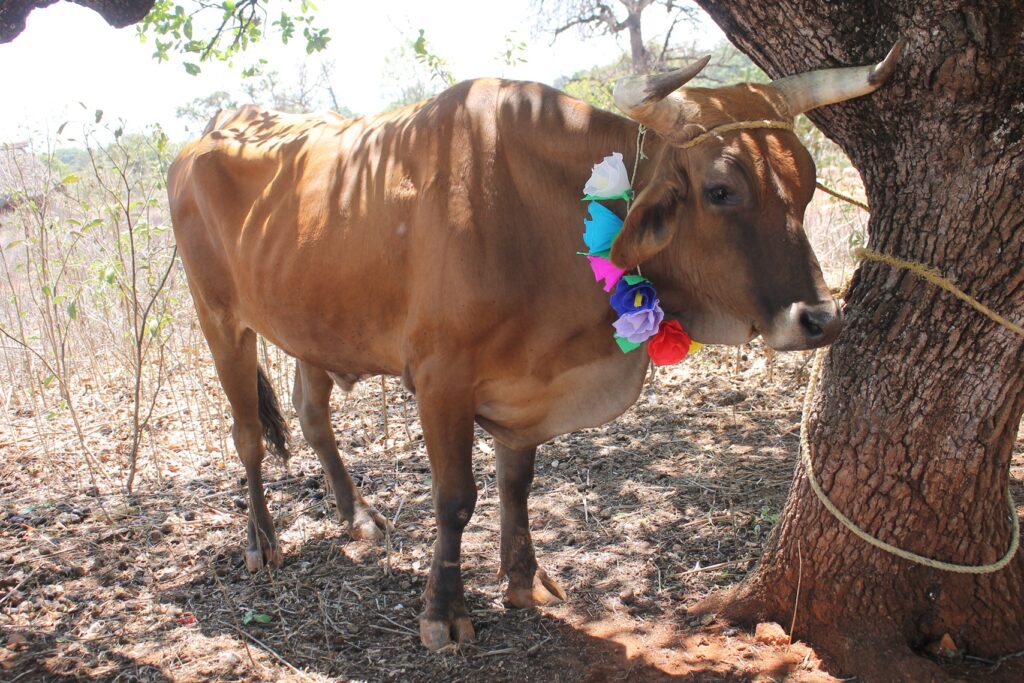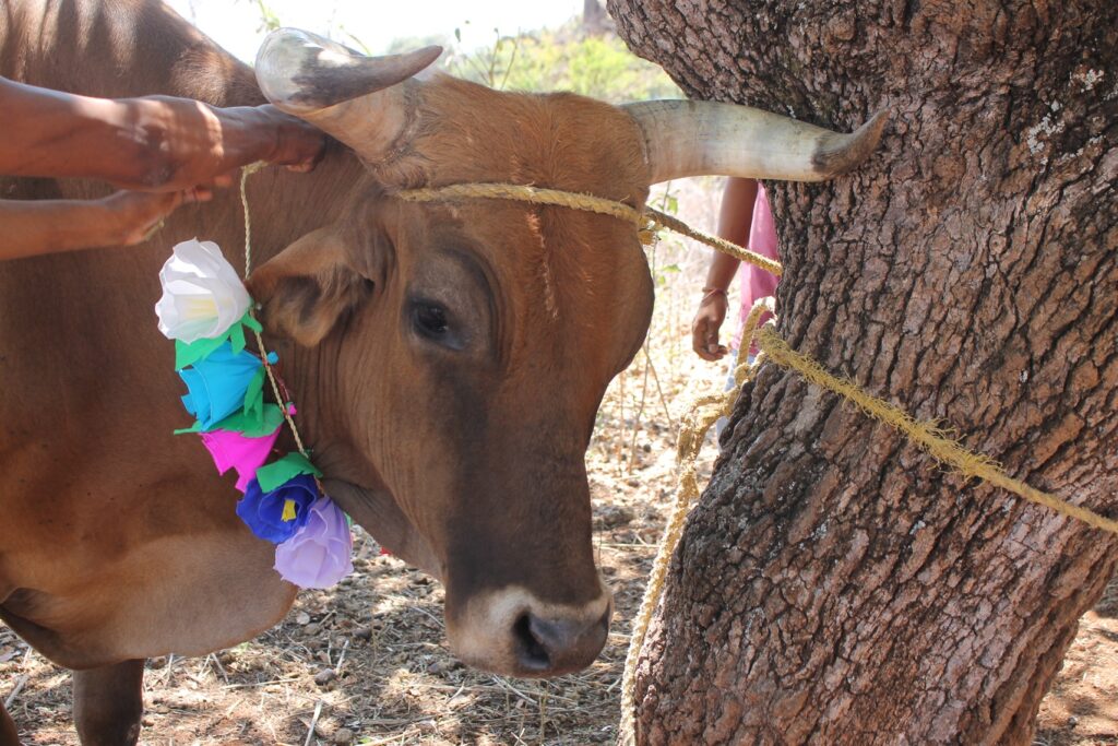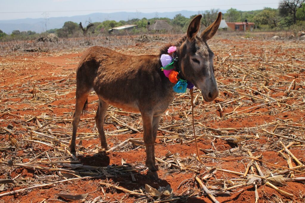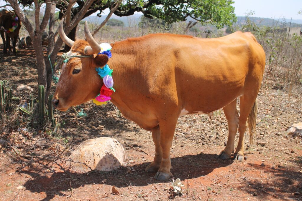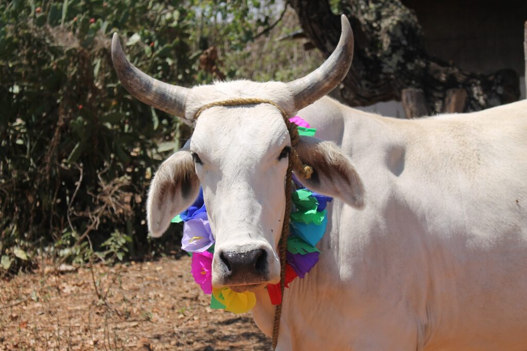 Yucuxina adorna con flores a sus animales de trabajo hoy día de San Isidro Labrador.